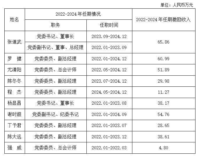 广东省港航集团有限公司企业负责人2022-2024年任期激励收入情况