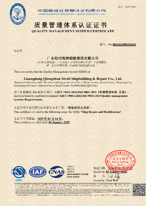ISO9001是国际标准化组织(ISO)发布的最具权威性的质量管理体系标准。质量管理体系认证标志着海峡船舶修造公司在船舶修理及改造领域建立了科学规范的质量管理体系,能够持续稳定地向客户提供满足要求的产品和服务,有助于提升客户满意度和市场竞争力。